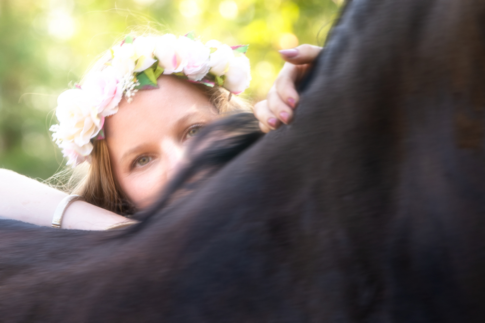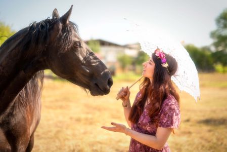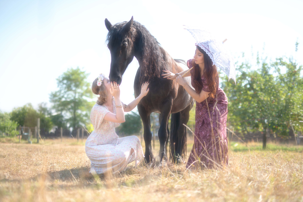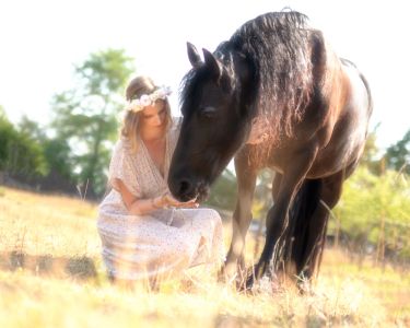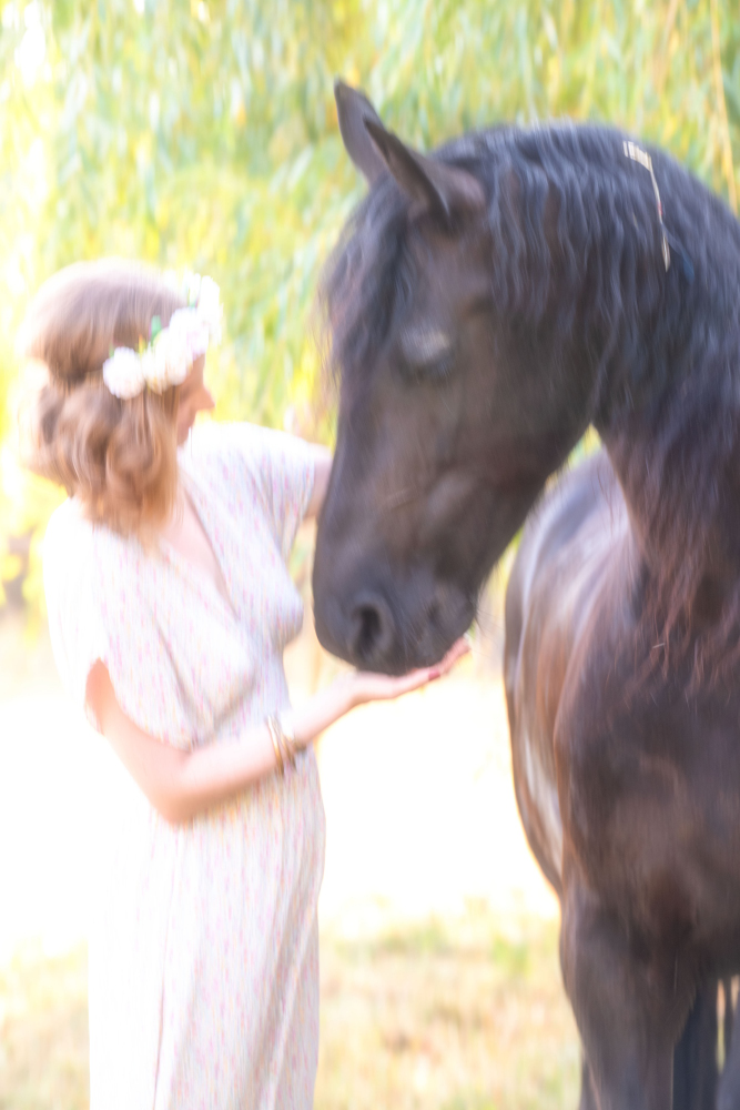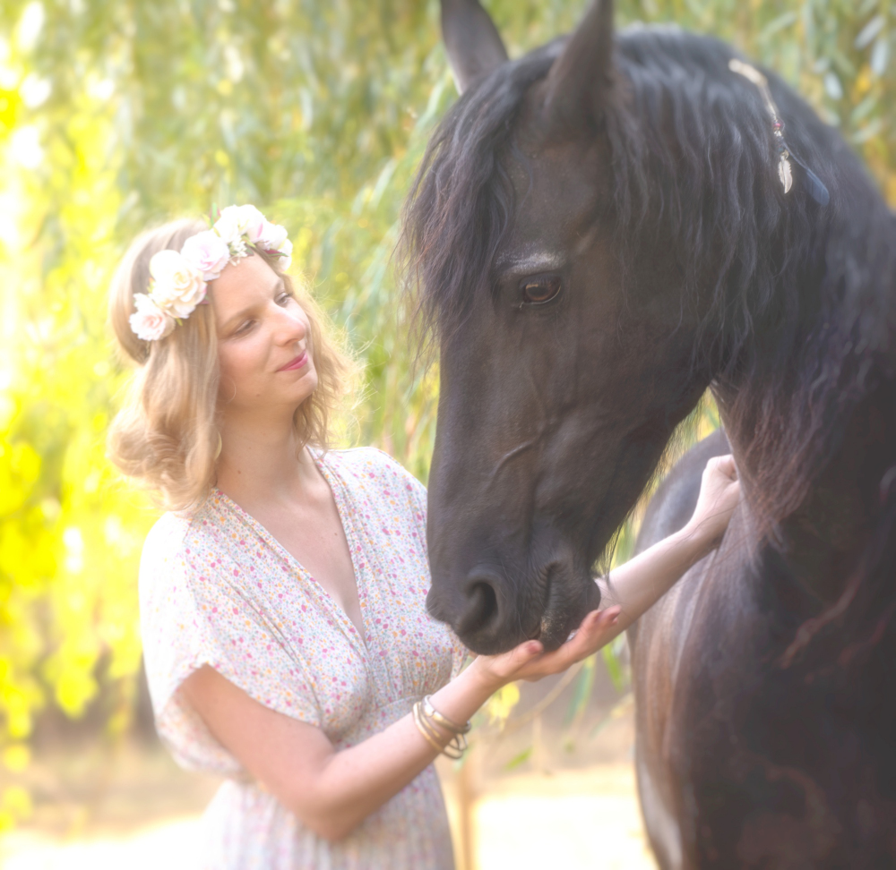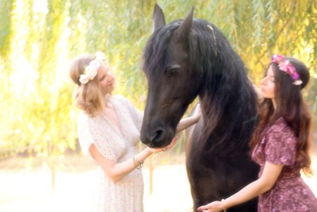 Dans un petit village niché au cœur de la campagne verdoyante, où les arbres dansaient au gré du vent et où le soleil doré caressait les champs à perte de vue, vivait une jeune fille nommée Lana. Lana était connue dans tout le village pour son amour des animaux, mais surtout pour sa relation particulière avec un magnifique cheval frison nommé Jasmijn. Jasmijn, avec sa robe noire brillante et sa crinière soyeuse, était bien plus qu'un simple animal pour Lana ; il était son confident, son ami le plus fidèle.