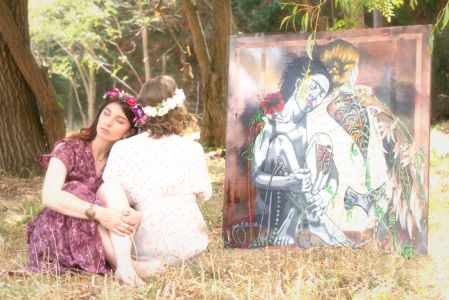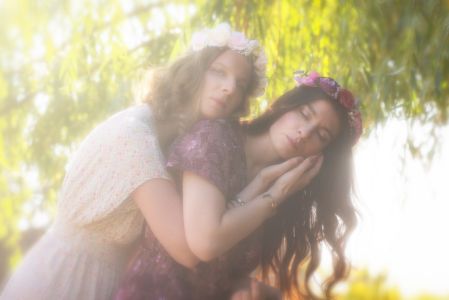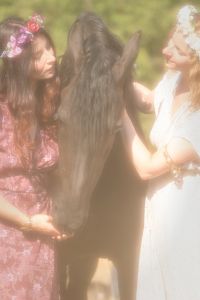 Un jour d'été particulièrement ensoleillé, Lana décida de se promener avec Jasmijn le long de la rivière qui serpentait à travers les champs. Elle portait une robe pourpre qui contrastait magnifiquement avec la robe sombre de Jasmijn. Alors qu'ils avançaient lentement, profitant de la douceur du jour, Lana entendit un rire cristallin derrière elle. Elle se retourna et vit sa meilleure amie, Annabelle, s'approcher d'eux. Annabelle, vêtue d'une robe blanche ornée de fleurs délicates, avait les cheveux parés d'une couronne de fleurs blanches qui ajoutait une touche de magie à son apparence.