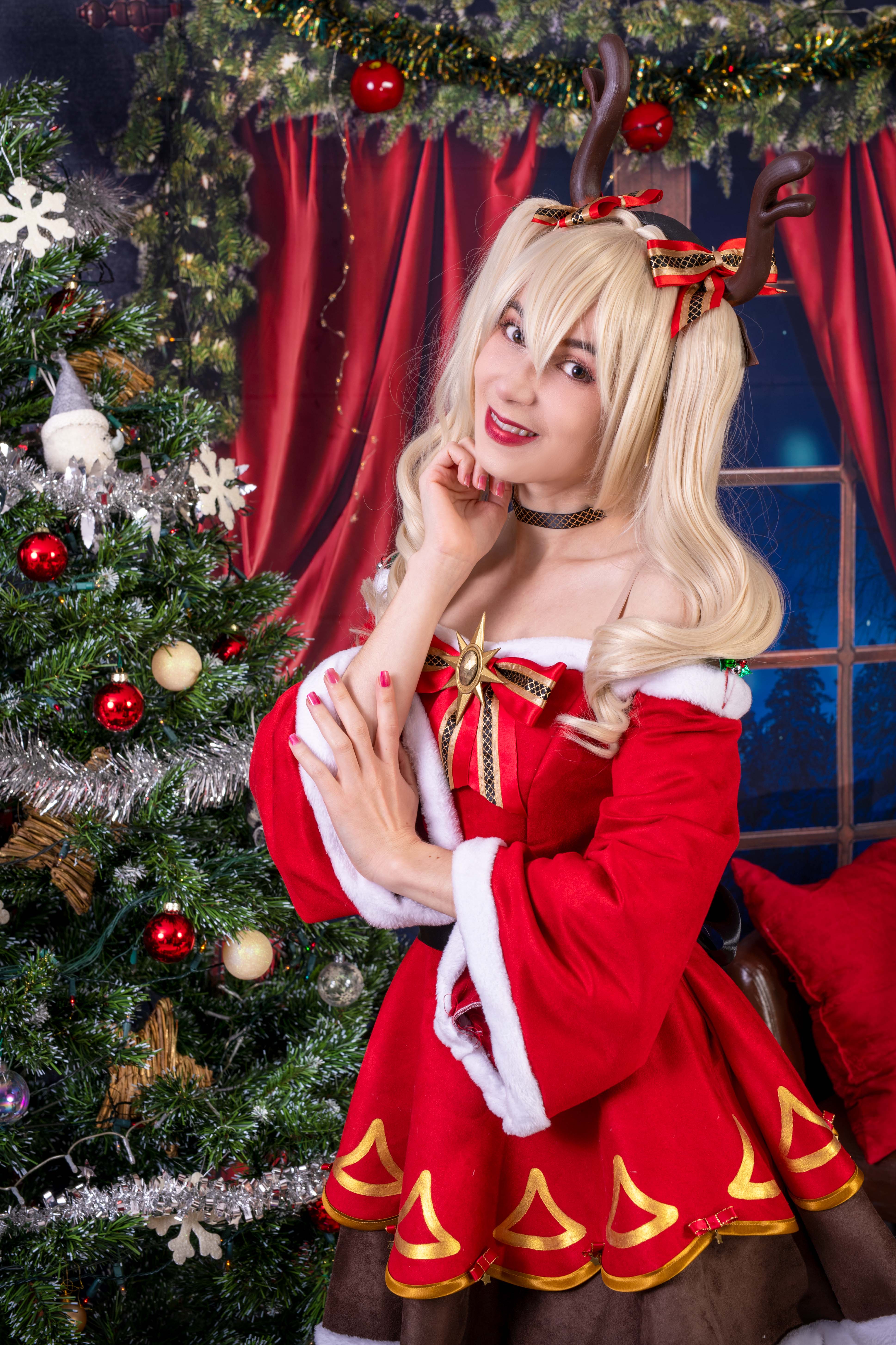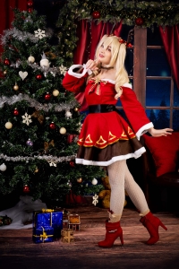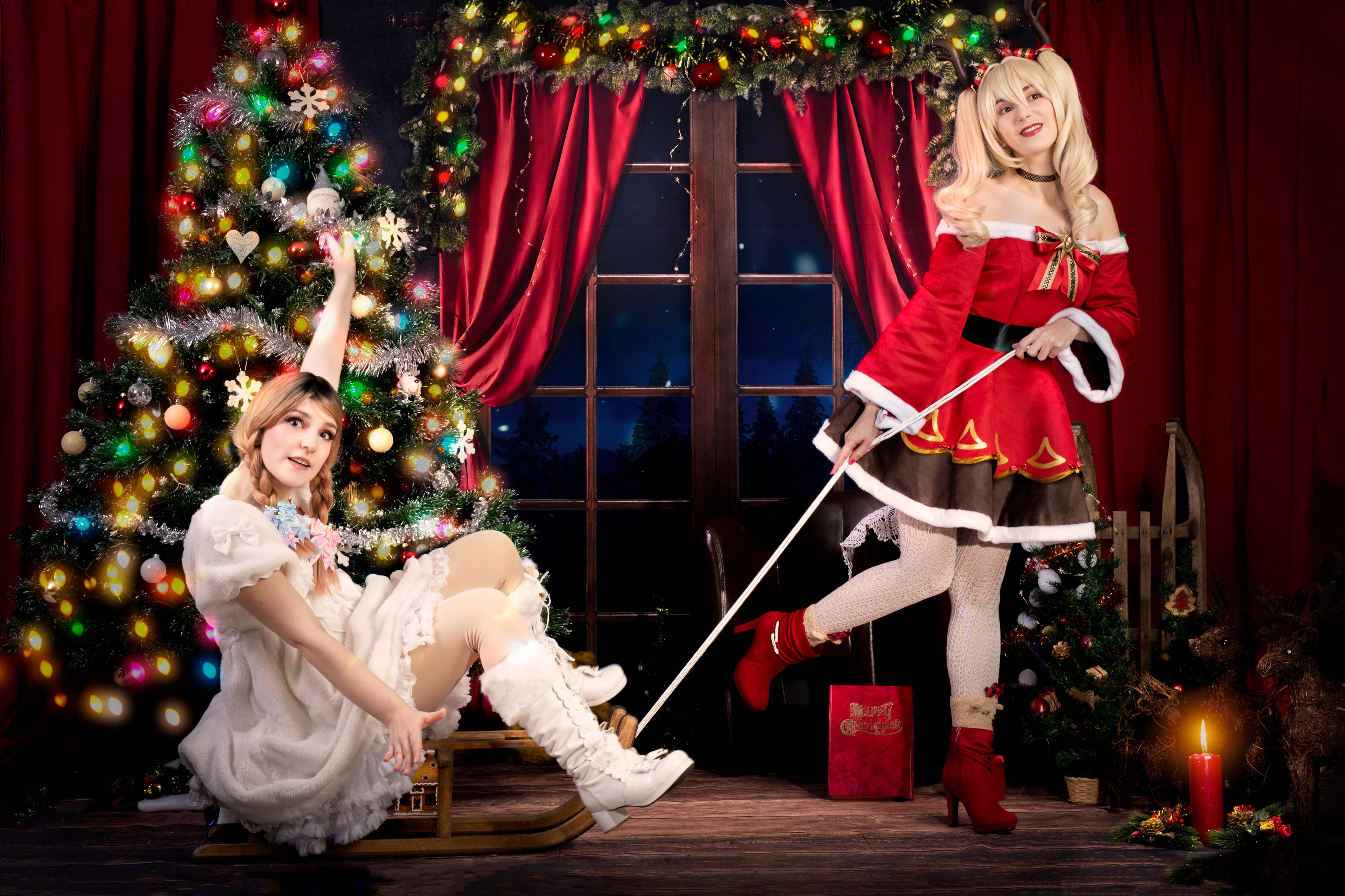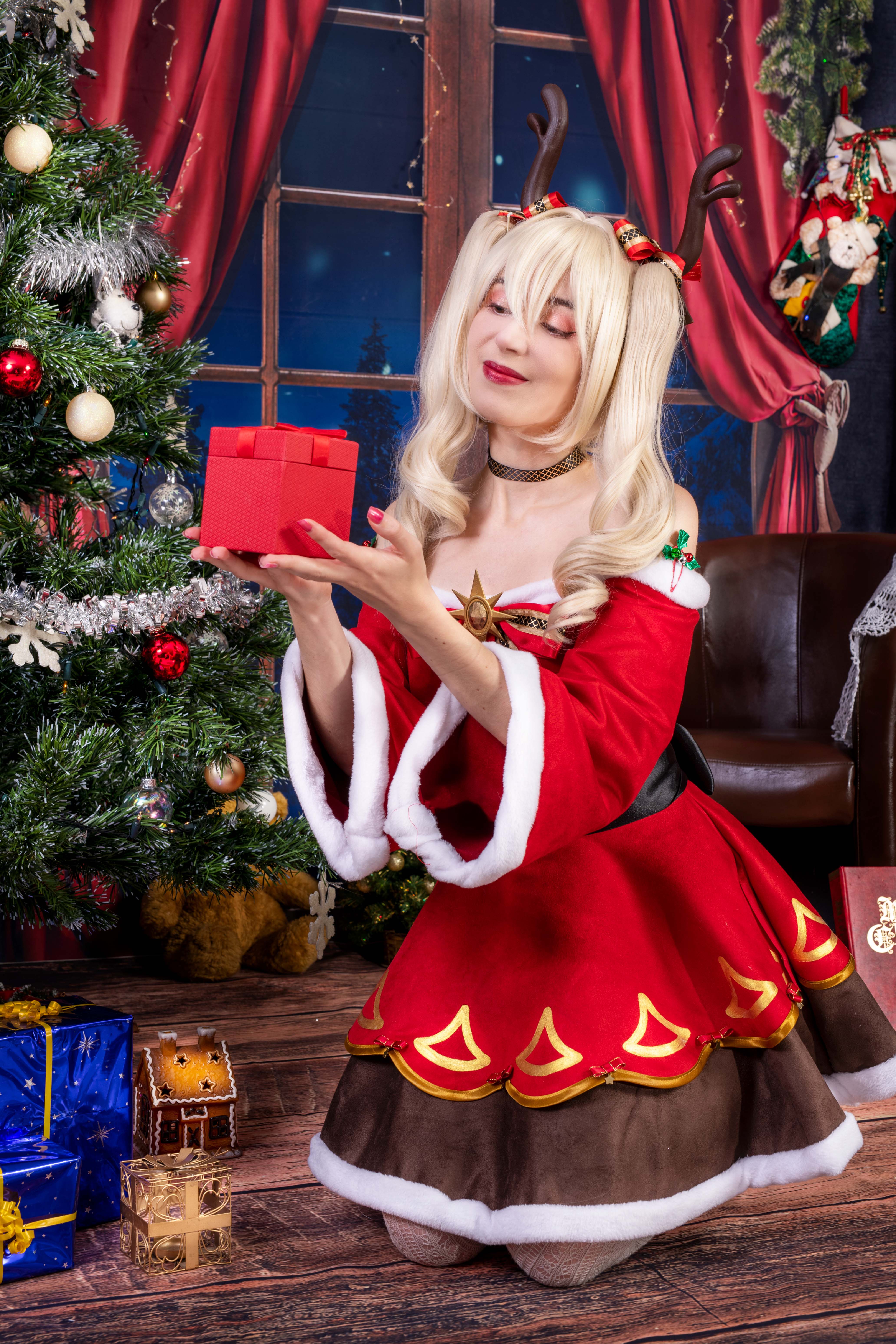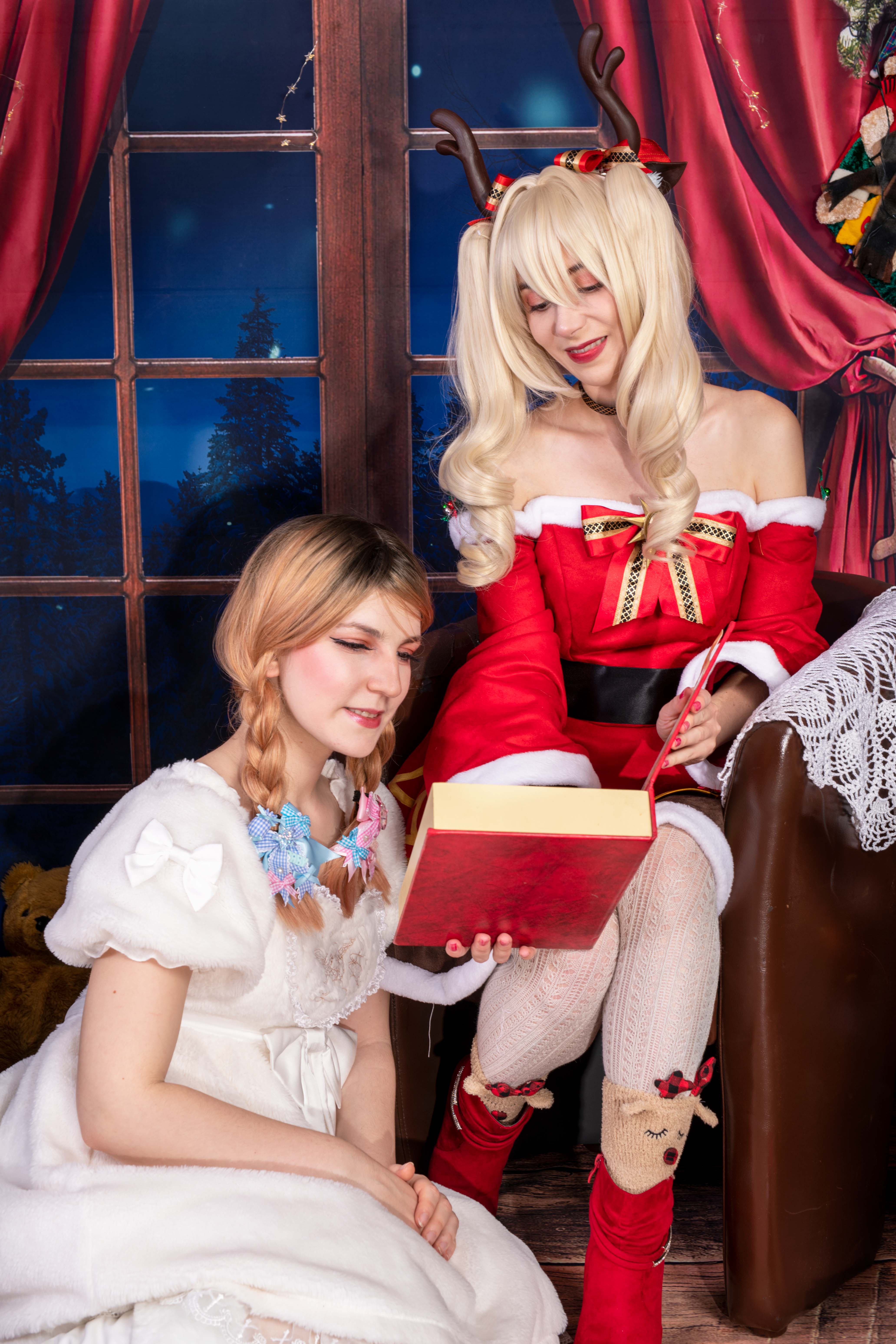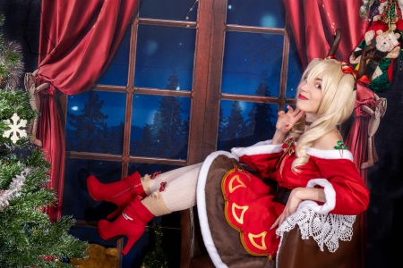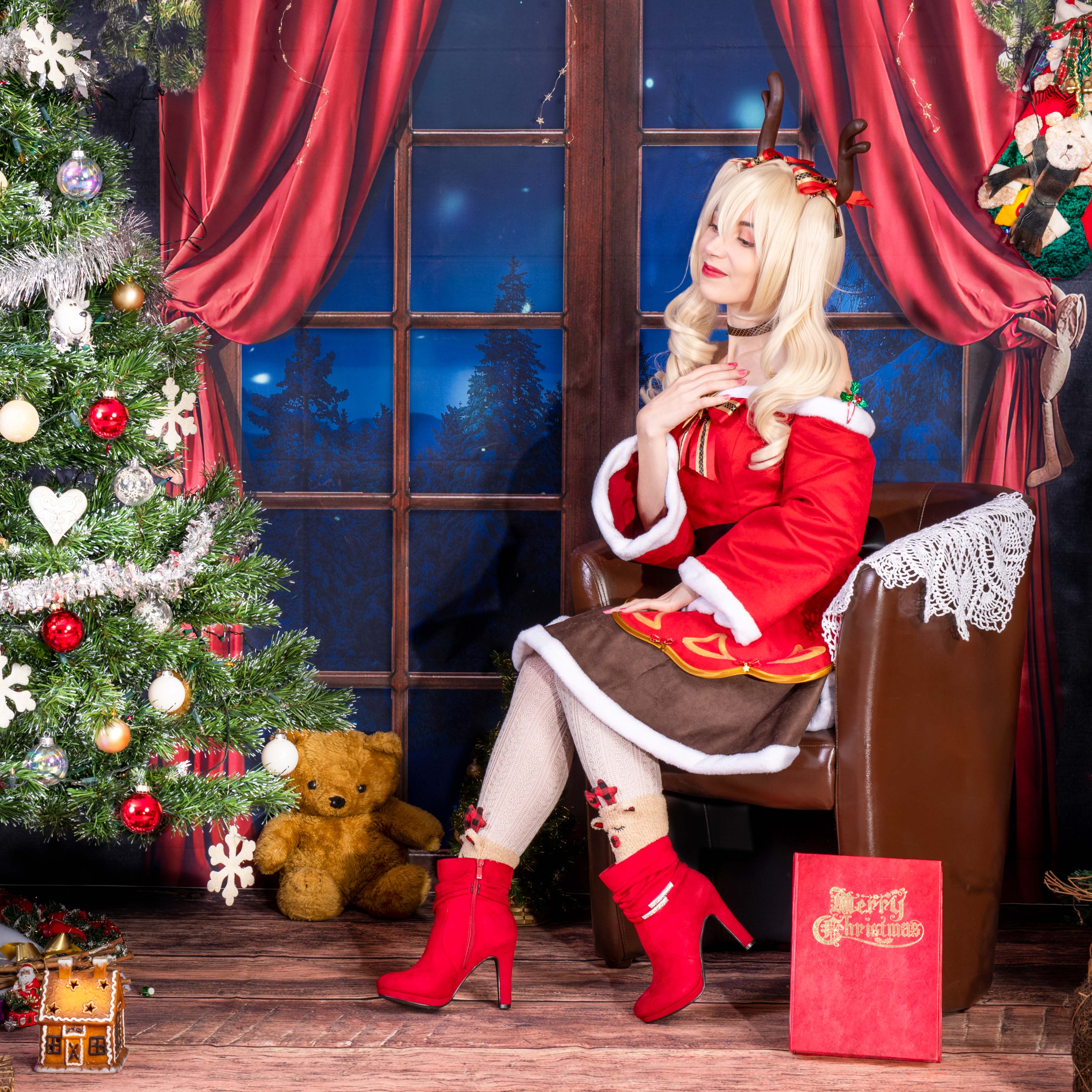Un soir de décembre, alors que la neige tombait doucement à l'extérieur, Éloïse s'installa près de la cheminée, vêtue d'une magnifique robe de Noël rouge et blanc, avec une couronne de sapin et de baies sur la tête. Elle avait allumé une bougie rouge qui répandait une douce lueur dans la pièce, créant une atmosphère chaleureuse et accueillante.