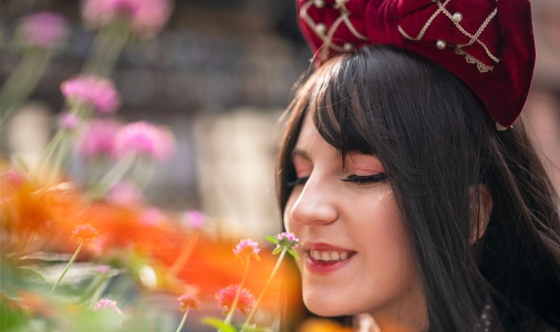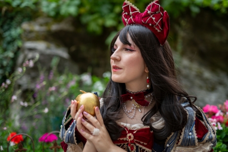 Le soleil filtrait à travers les feuilles des vignes qui grimpaient le long des murs de pierre, dessinant des motifs dorés sur les pavés de la vieille ville alsacienne. Kaysersberg, avec ses maisons à colombages et ses ruelles sinueuses, semblait tout droit sorti d’un conte. C’est dans ce décor que Blanche Neige, vêtue d’une robe bleu nuit brodée de motifs dorés et coiffée d’un grand nœud rouge, s’aventurait ce matin-là.