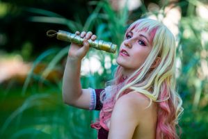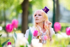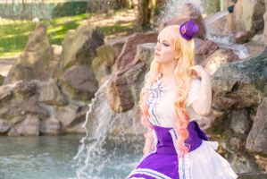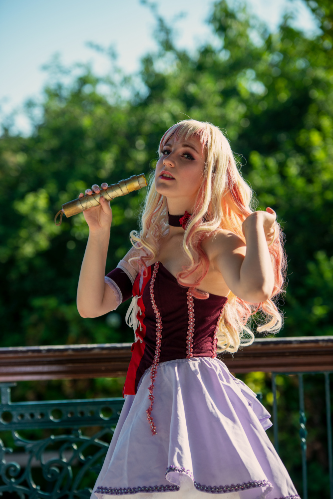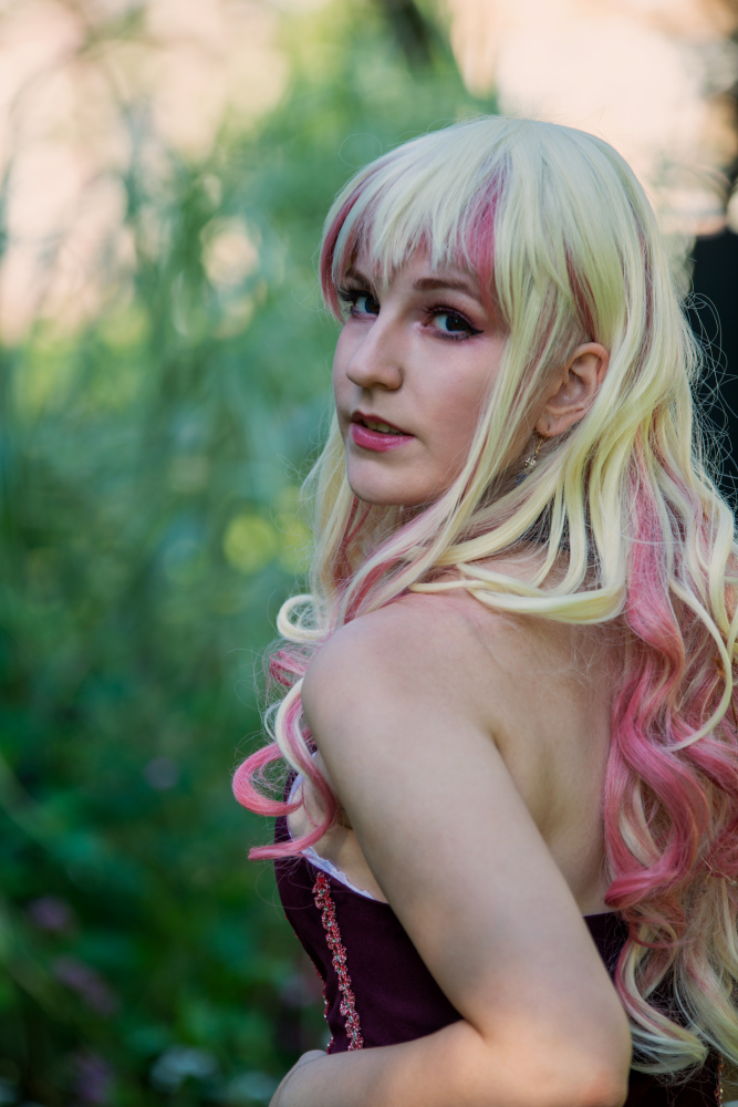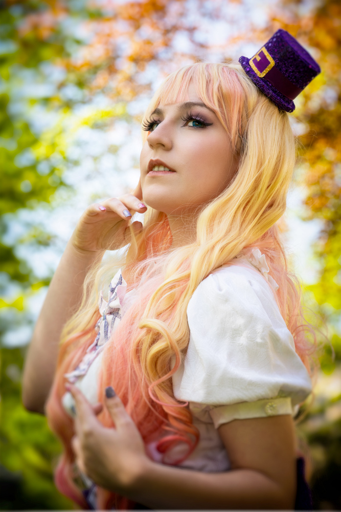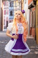 Son reflet dans la vitre embuée d’une boutique abandonnée lui avait révélé une métamorphose : ses cheveux, d’ordinaire doux et discrets, s’étaient transformés en une cascade de boucles dorées et roses, comme teintes par les premiers rayons du soleil. Et cette robe… Une robe de servante céleste, blanche et violette, ornée de rubans et de dentelles qui semblaient tissés avec des filaments de lumière. Sur sa tête, un petit chapeau à clochette, violet et or, oscillait légèrement, comme s’il était animé d’une vie propre.